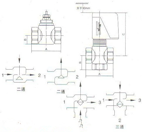 三、VA7010系列風機盤管電動閥結構、尺寸及安裝示意圖: