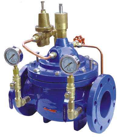 當閥門從進口端給水時,水流過針閥進入主閥控制室,并經(jīng)過導(dǎo)閥、球閥流出主閥控制室到出口,此時主閥處于全開或浮動狀態(tài)。調(diào)定主閥上部的流量調(diào)節(jié)閥,可為主閥設(shè)定一定開度。